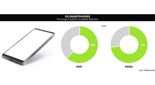Faster download speeds are only one benefit of the latest generation of cellular technology. 5G also promises lower latency and it will accommodate a greater number of devices simultaneously. For consumers, 5G will be top of mind when they upgrade to the latest smartphone models in 2022. Seventy three percent of the 154 million smartphones expected to ship this year will be 5G-enabled, according to CTA’s U.S. Consumer Technology One-Year Industry Forecast. (January 2022)