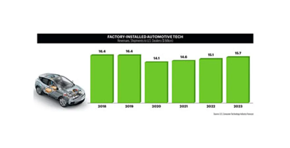 Factory-installed vehicle tech has endured a bumpier ride over the past three years, but car manufacturers continue to push the boundaries on automation and electrification. The vehicle tech segment should enjoy a smoother ride in 2023 as supply chain bottlenecks clear, and could generate more than $15 billion in revenue this year. The industry looks to improve battery tech, voice and gesture controls, vehicle-to-everything (V2X) infrastructure and heads-up displays.