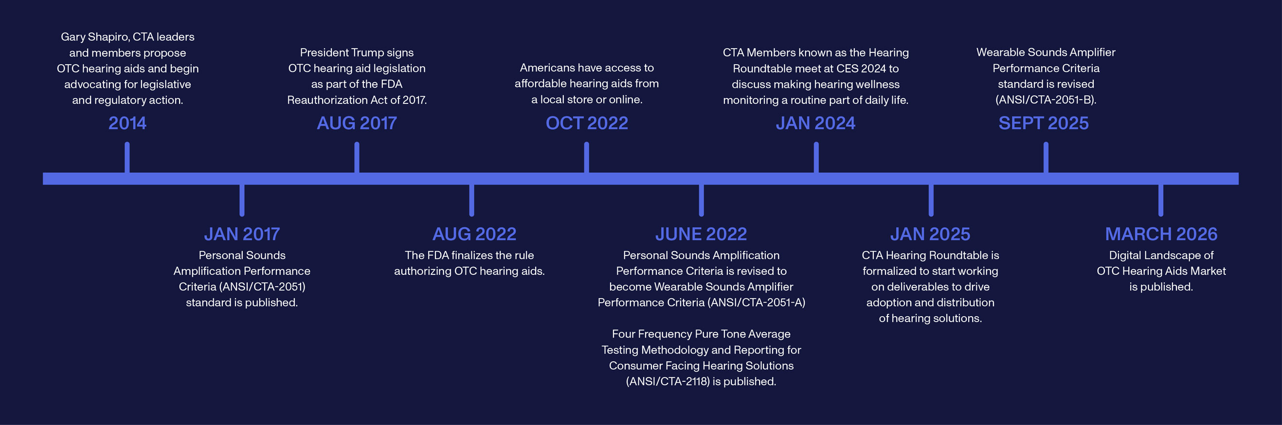CTA, member companies and allied organizations have continued to advance the OTC hearing aid category since the FDA's final rule in 2022. This page is a culmination of previous and ongoing efforts to activate this category and advance access, awareness, and adoption.